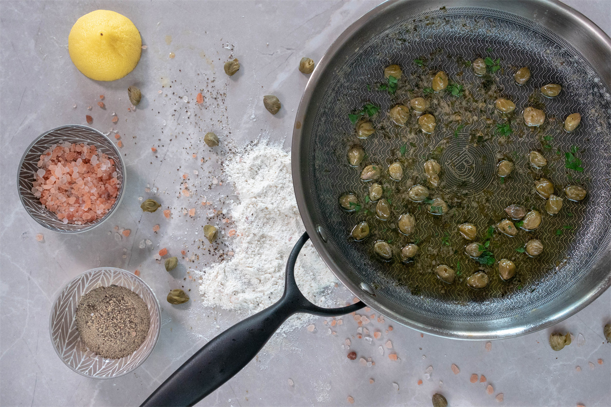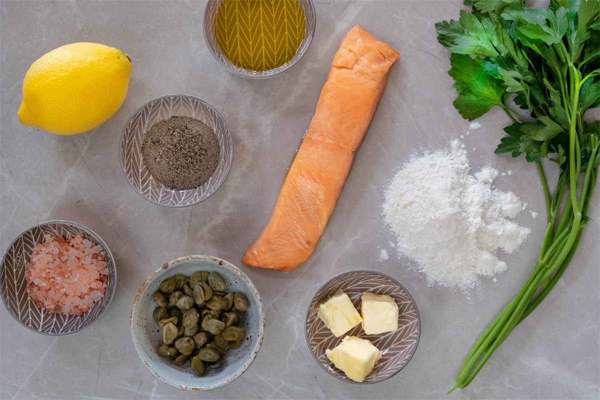 把三文鱼从锅里拿出来,然后加入黄油、刺山柑和柠檬汁。煮2分钟,最后加入切碎的欧芹。