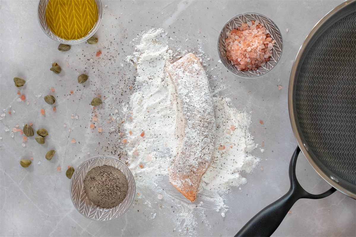 把三文鱼片清洗干净。加入面粉,用盐和胡椒粉调味。