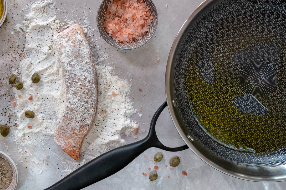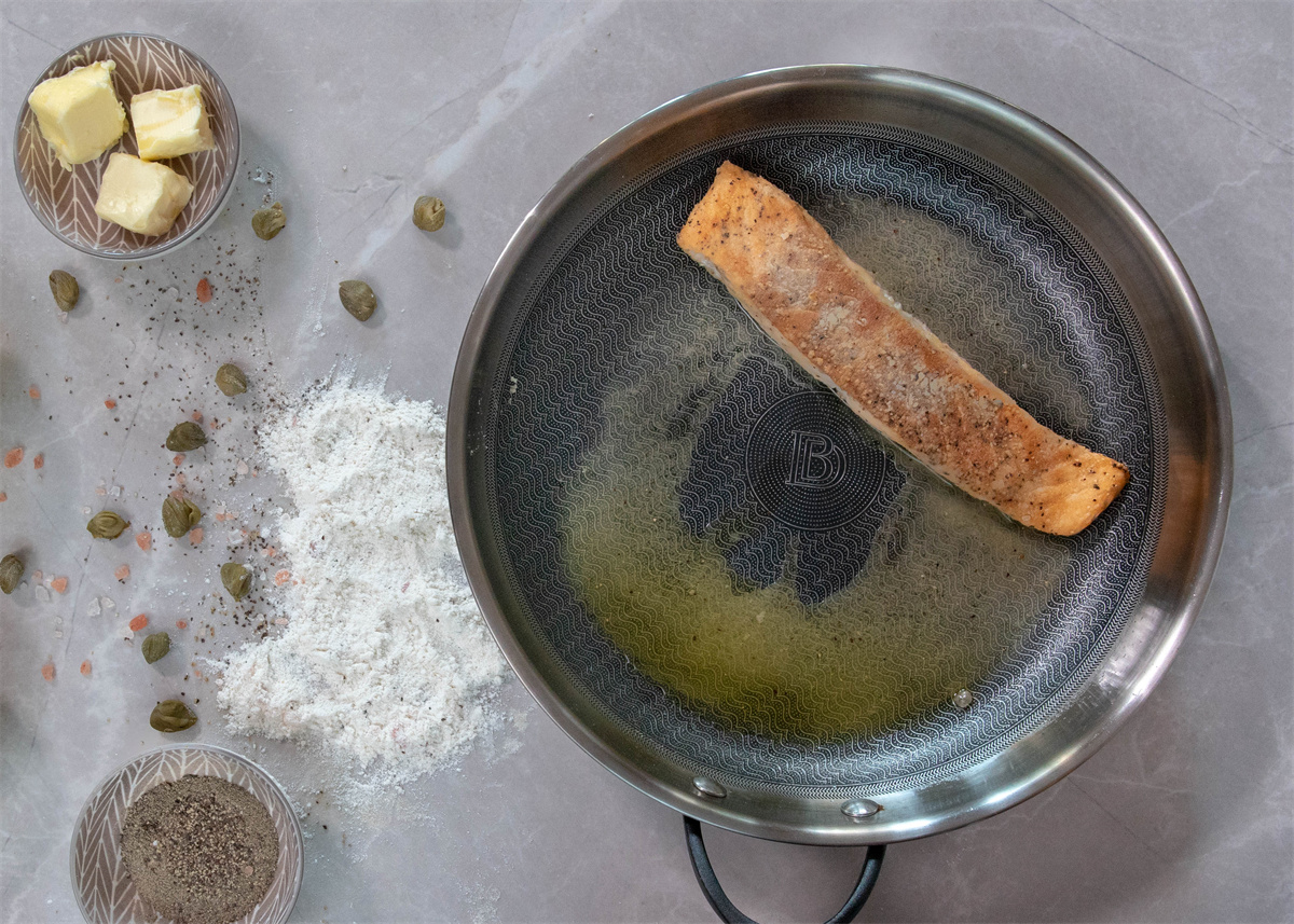 把鲑鱼翻过来,完成烹饪。